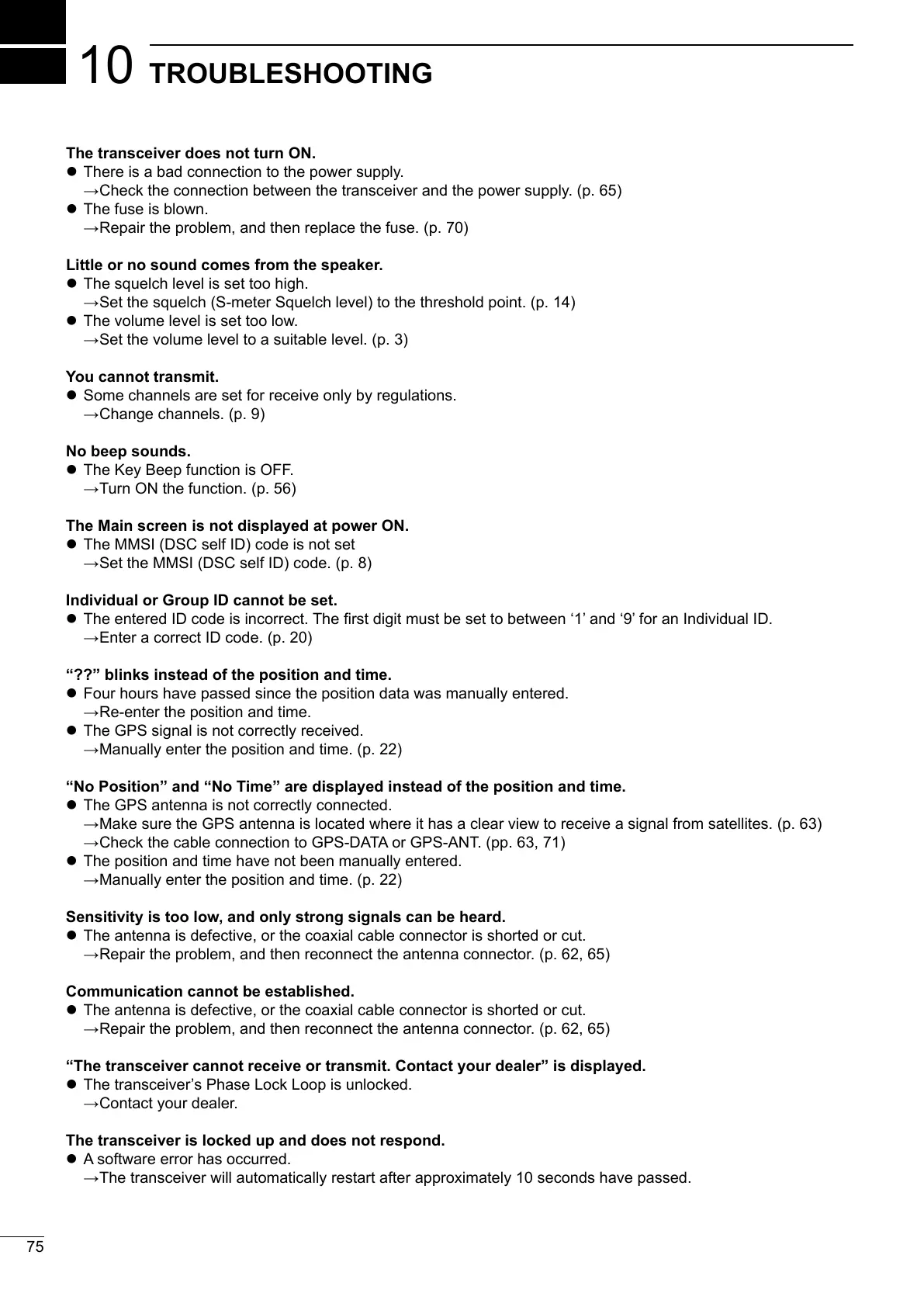 Check the connection between the transceiver and the power supply. (p. 65)