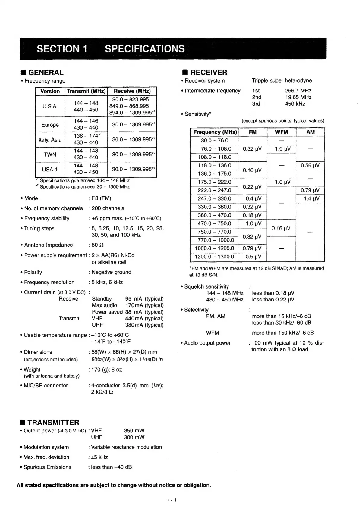 Icom IC-Q7E - SECTION 1 SPECIFICATIONS; Receiver Sensitivity Specifications