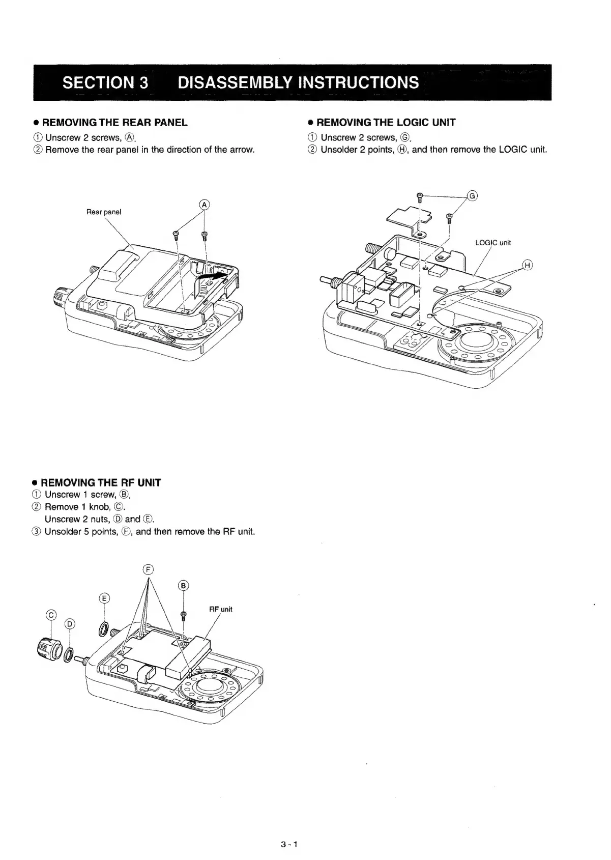 Icom IC-Q7E - SECTION 3 DISASSEMBLY INSTRUCTIONS; Rear Panel Disassembly; Logic Unit Disassembly; RF Unit Disassembly