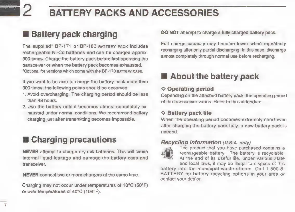 Icom IC-T22A - 2 BATTERY PACKS AND ACCESSORIES; Battery Charging and Precautions