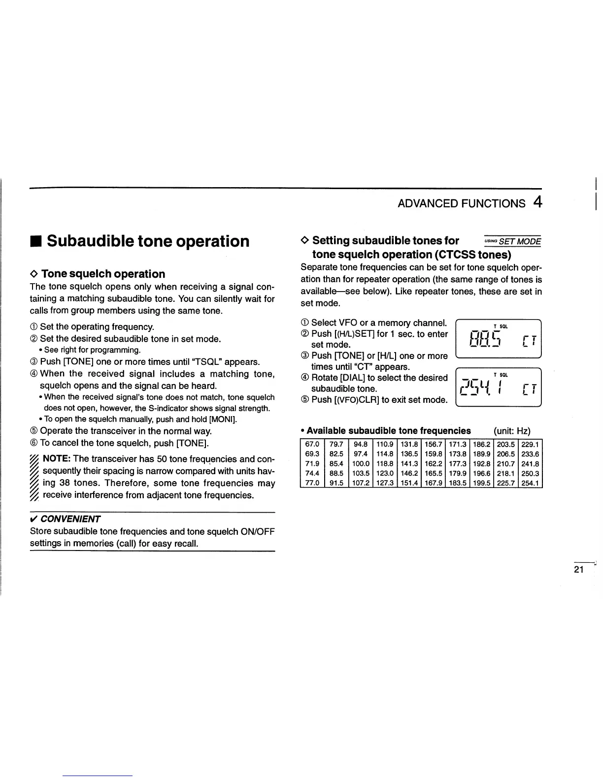 Icom IC-T7A - Subaudible Tone Operation; Tone Squelch Operation; Setting Subaudible Tones for Tone Squelch Operation