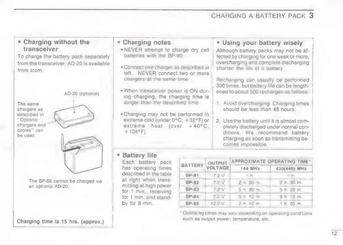 Icom IC-W2E - Charging Notes, Battery Life, and Usage