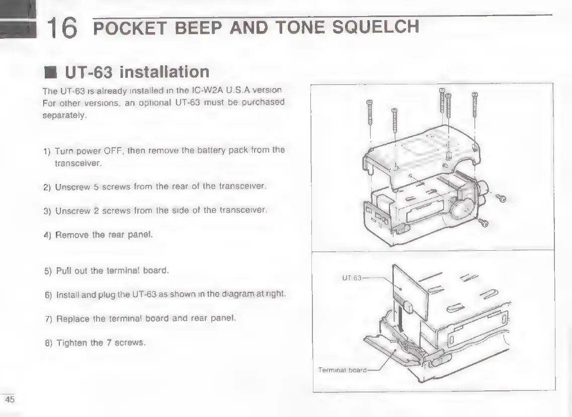 Icom IC-W2E - Pocket Beep and Tone Squelch; UT-63 Unit Installation