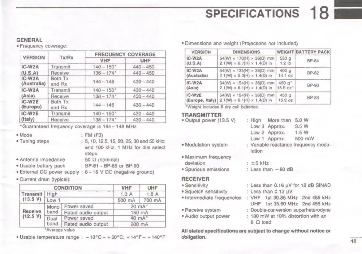 Icom IC-W2E - Technical Specifications