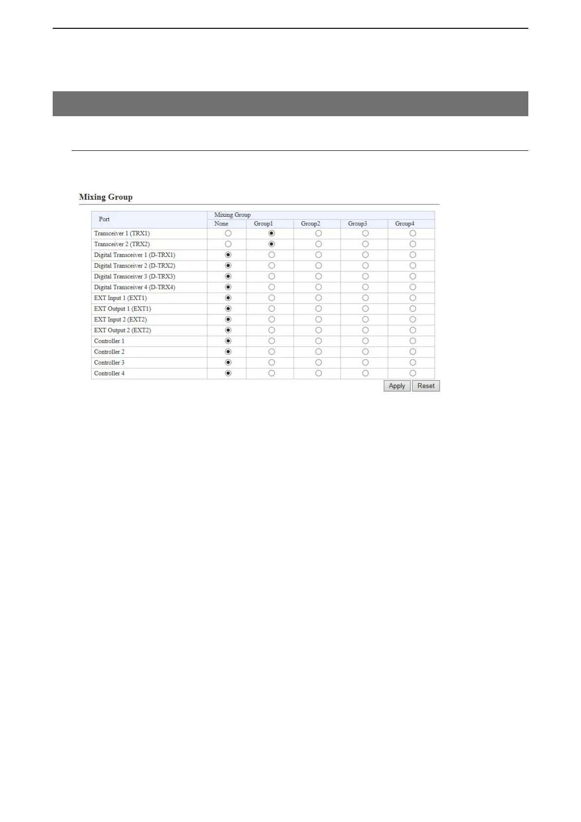 In the above example, the audio signal of the [TRX1] port and [TRX2] port are mixed with.