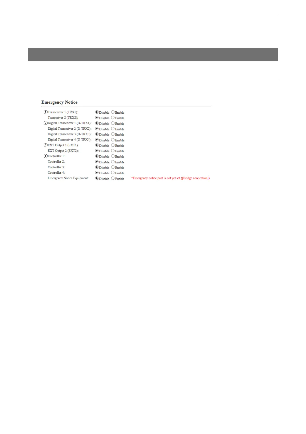 Transceiver 2 (TRX2) …… If you select “Enable,” the emergency notice is sent to the port ([TRX1]/