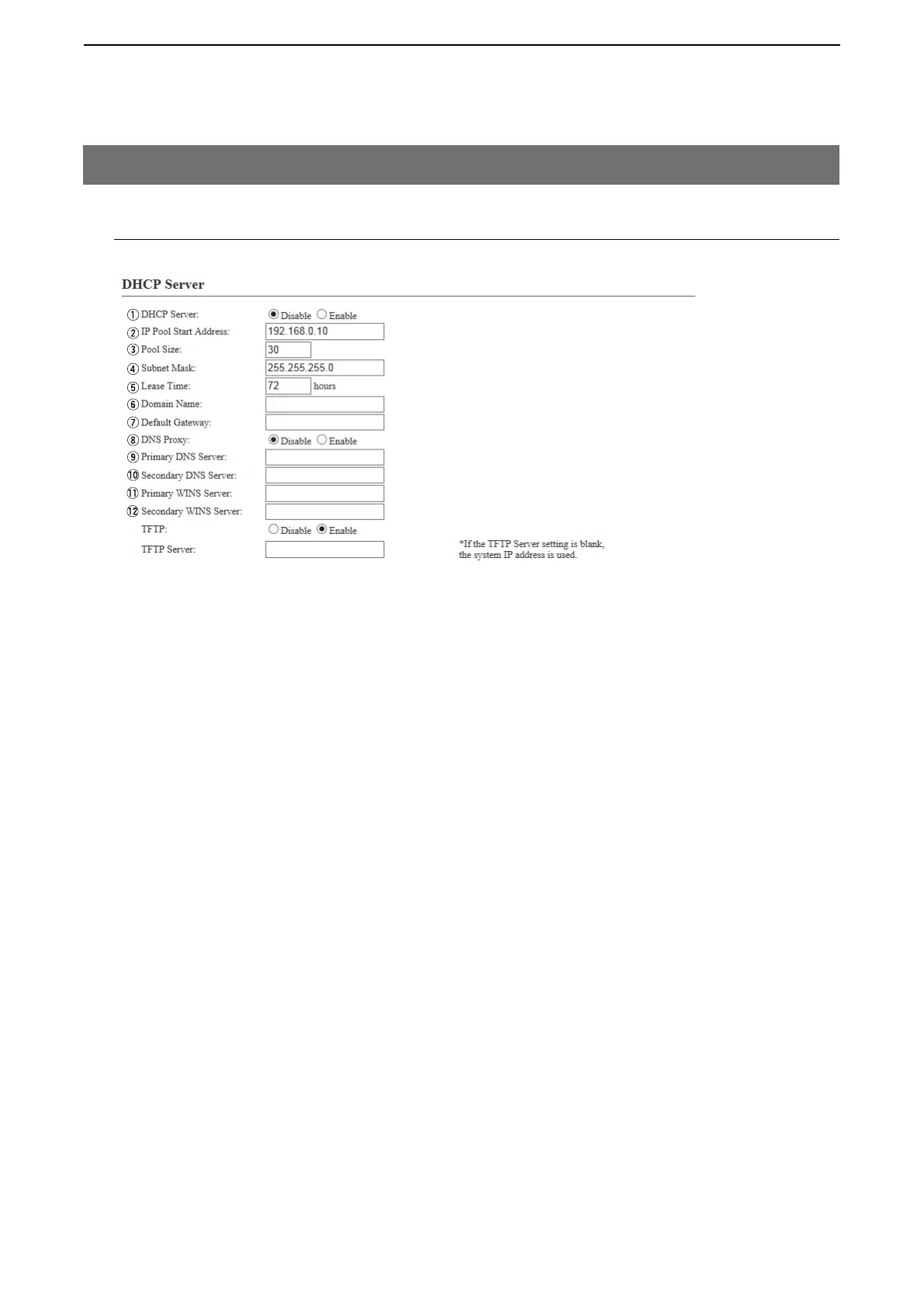 q DHCP Server …………… Select Enable to use the DHCP Server function. (Default: Disable)