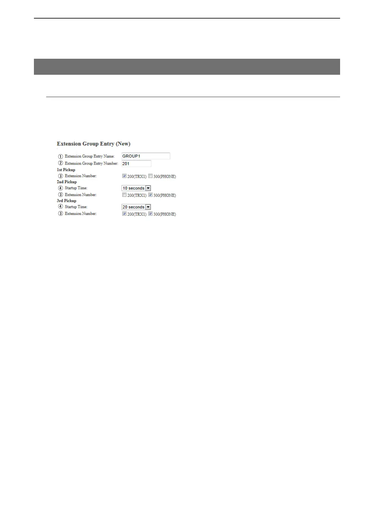 • In this example, when the extension group number “201” received an incoming call, the call designated to “200”