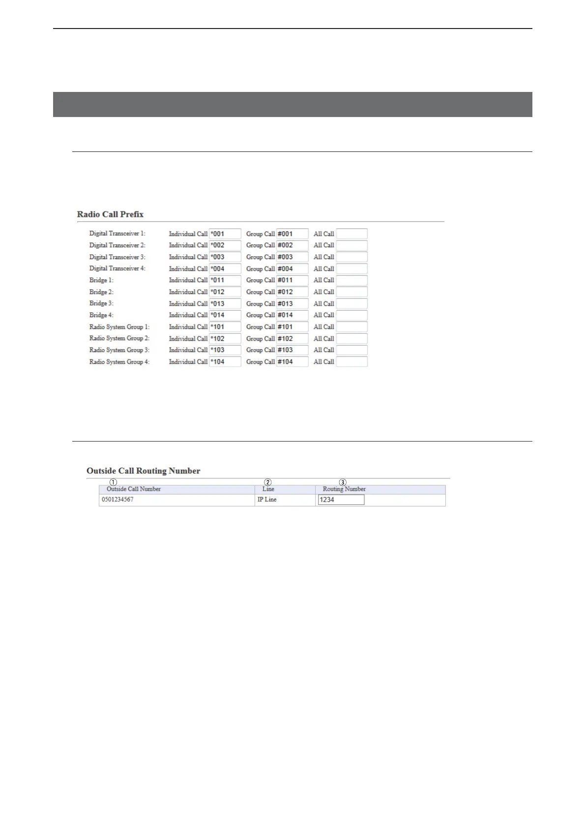 • Example: To make an individual call to Digital Transceiver 1 (Prefix ID: 1, ID: 6), dial “*001010006.”