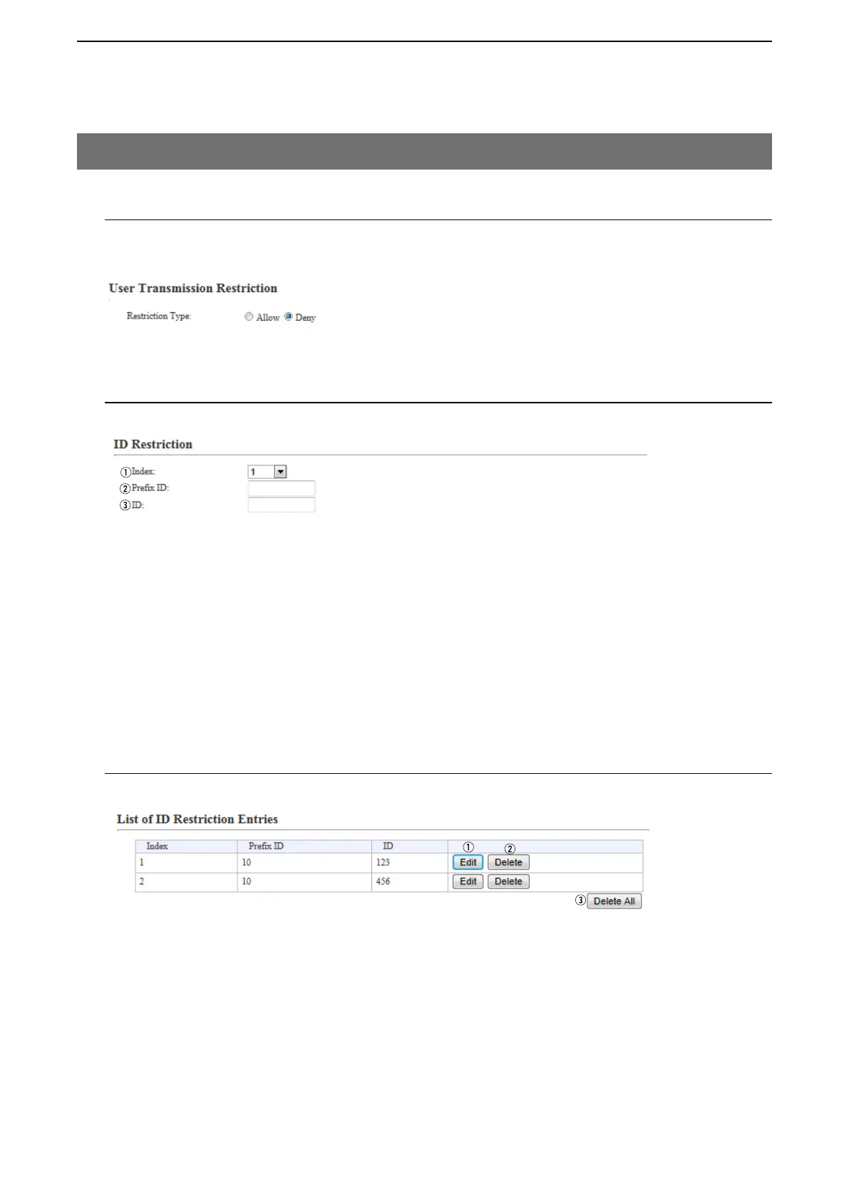 If “Deny” is selected, the outgoing call by the radio listed on the [List of ID Restriction Entries] is restricted.