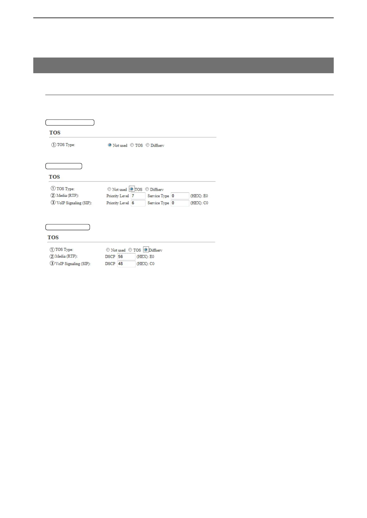q TOS type ………………… Select the TOS (Type-Of Service) format. (Default: TOS)