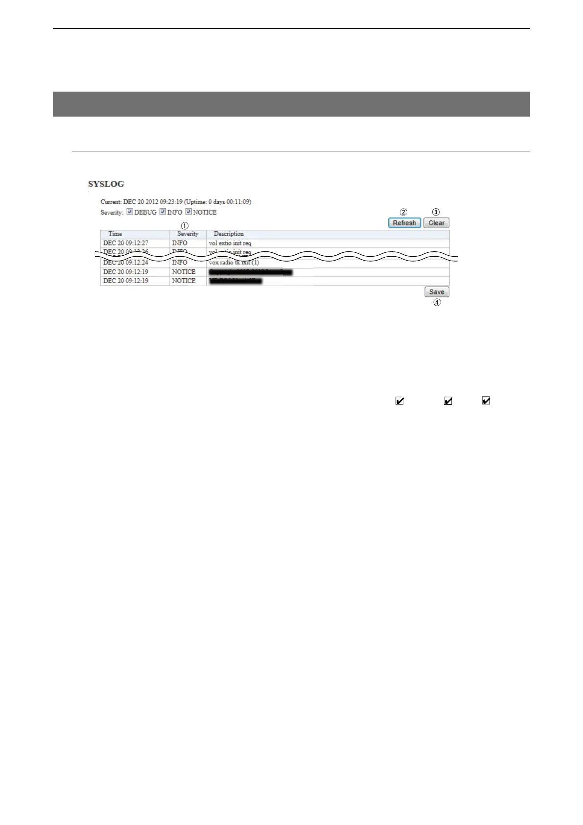 r <Save> …………………… Click to save the log to a PC with a text file (extension: “txt”).