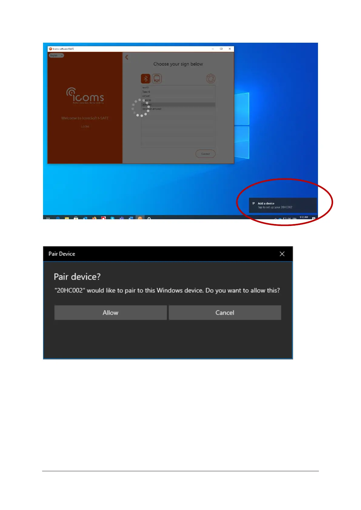 icoms I-SAFE - Screenshot 30: Adding the Bluetooth Device to Your Windows PC; Screenshot 31: Allow Windows to Pair with the Device