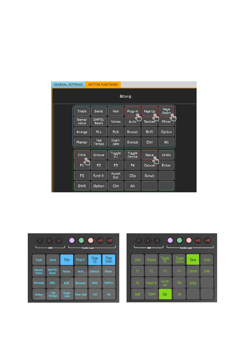 for Bitwig, "Plug in" and "Page Up/Down" are organized within the blue color mode,