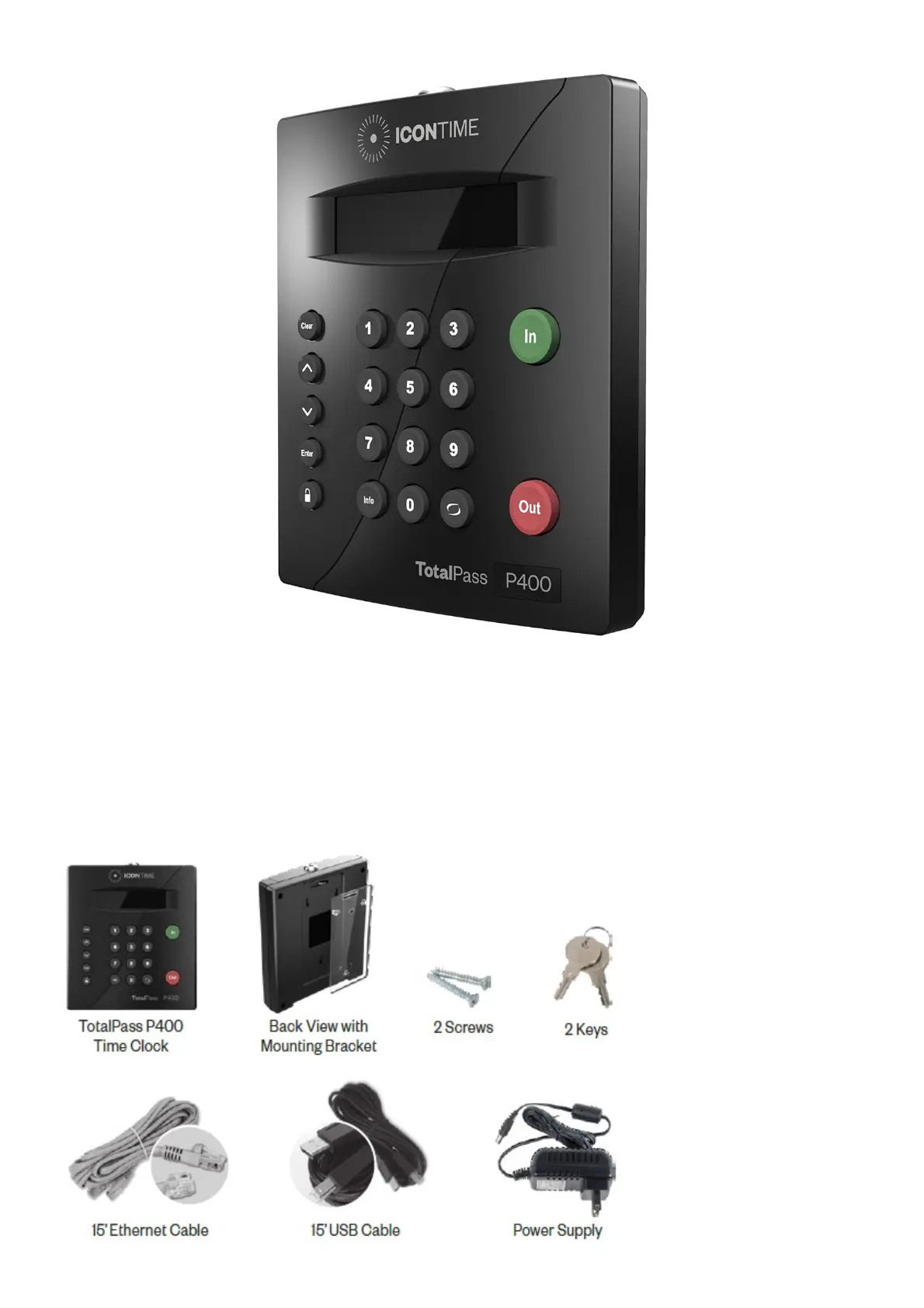 Below are the contents included with your TotalPass P400 time clock. If anything is missing, please contact our