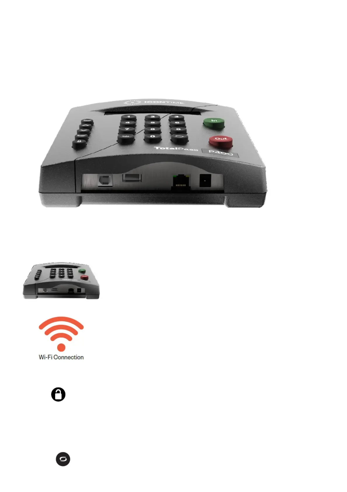 The TotalPass P400 time clock includes three connection options: Wi-Fi, Ethernet, or USB.