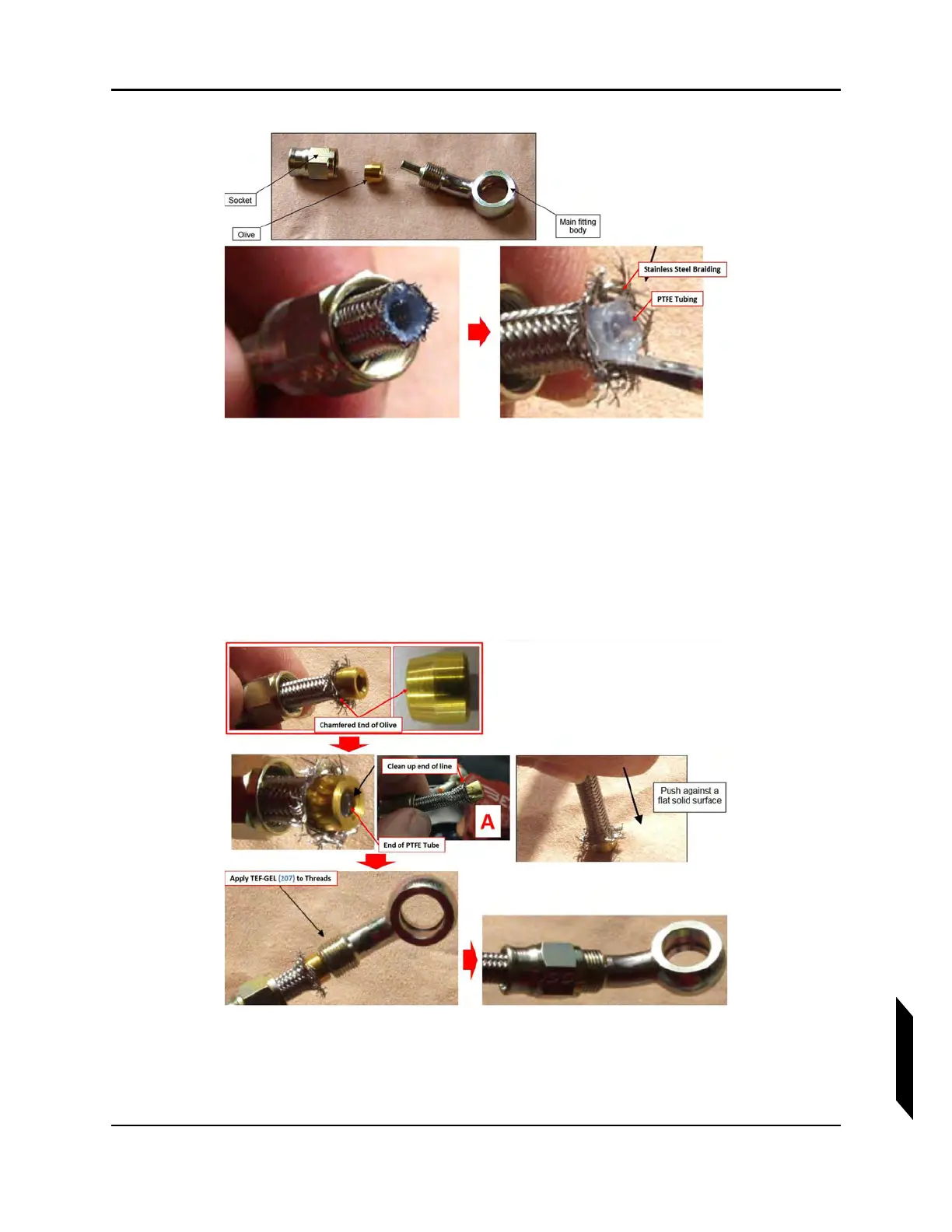 6. Push the chamfered end of the olive onto the PTFE inner liner and under the stainless steel braid,