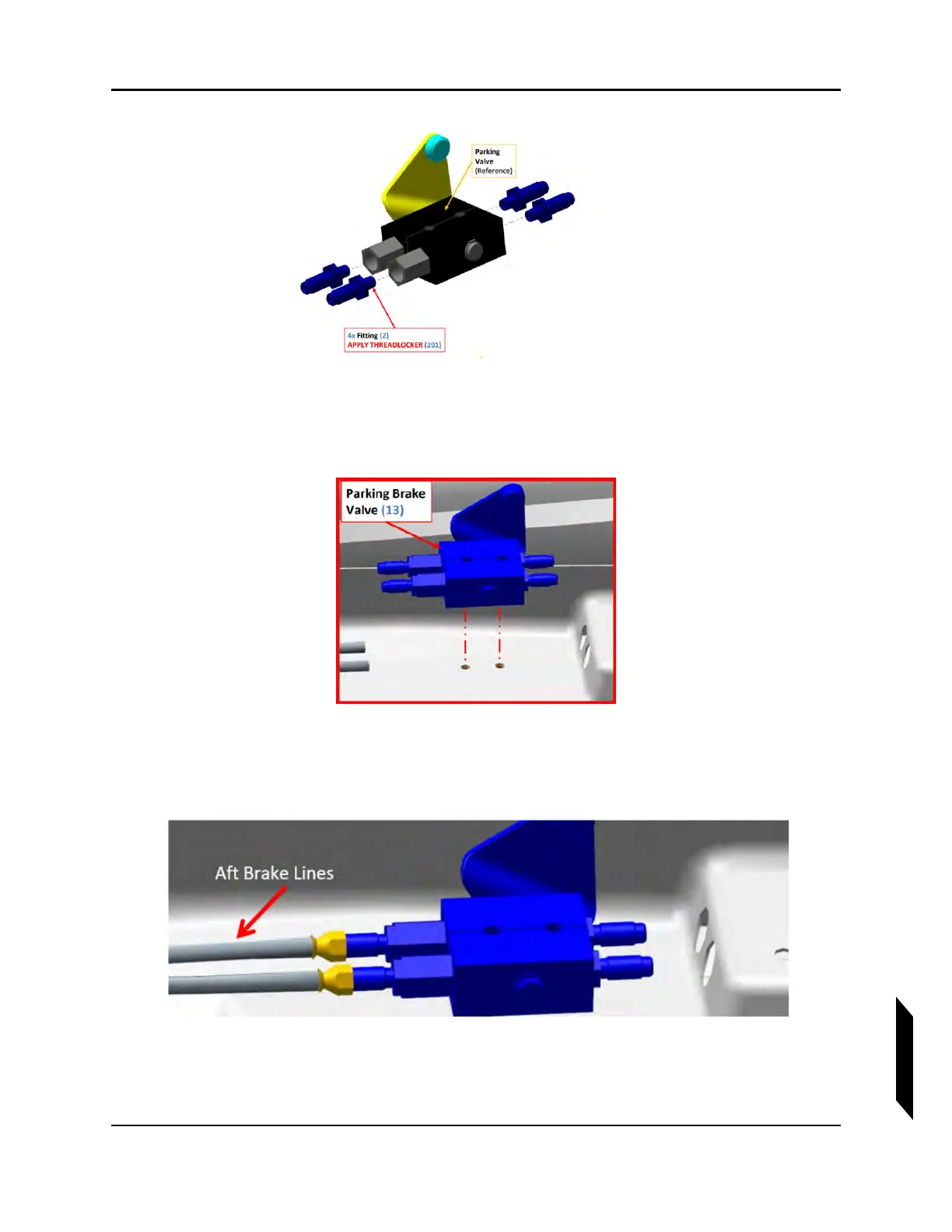 7. Connect AFT brake lines to parking brake valve. Torque fittings to 90-132 in-lb. Check that hard-
