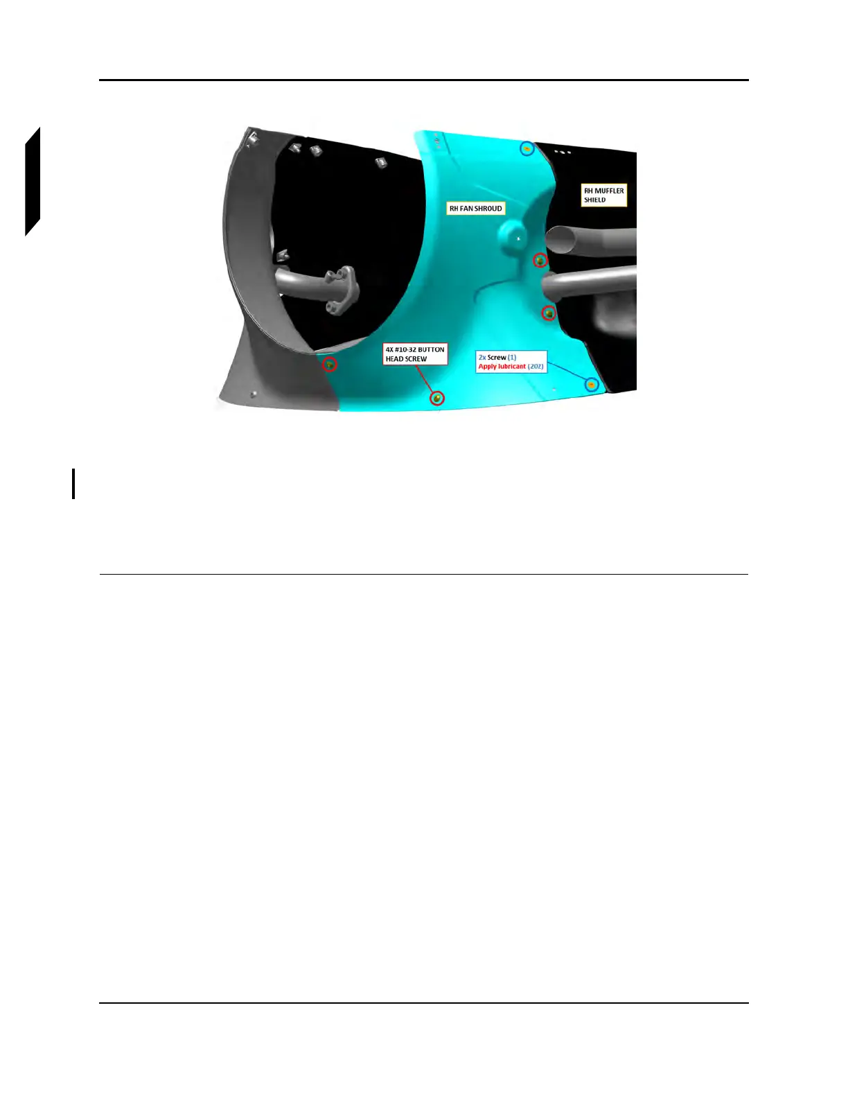 3. Install the LH and RH muffler fairing with nine button head screws using a #20 Torx driver. Apply