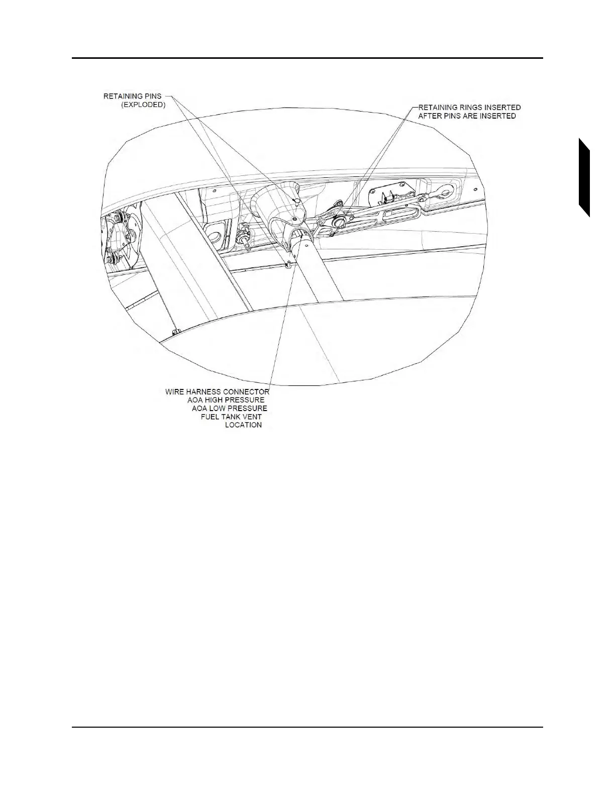 3. Locate the avionics tubes, electrical harness for lights, and fuel vent tube inside the hinge.