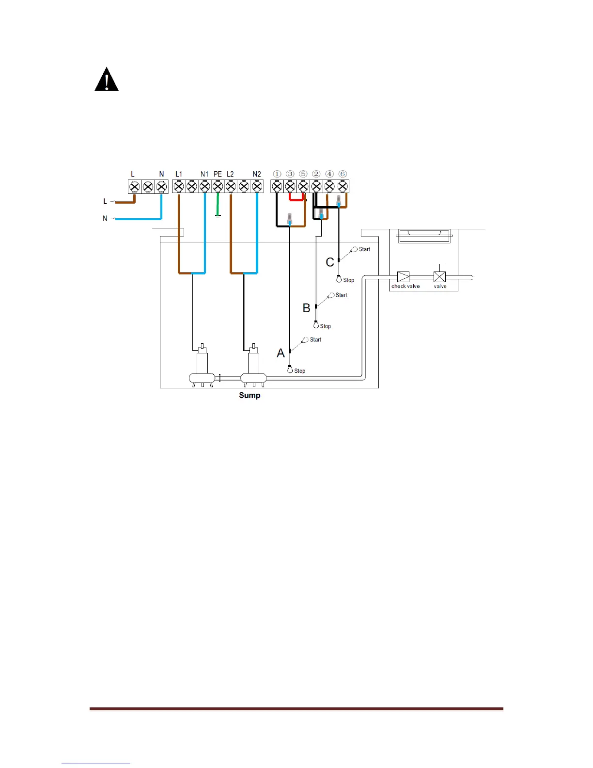 pump on) to terminals 2 and 4 and float switch D (alarm) to