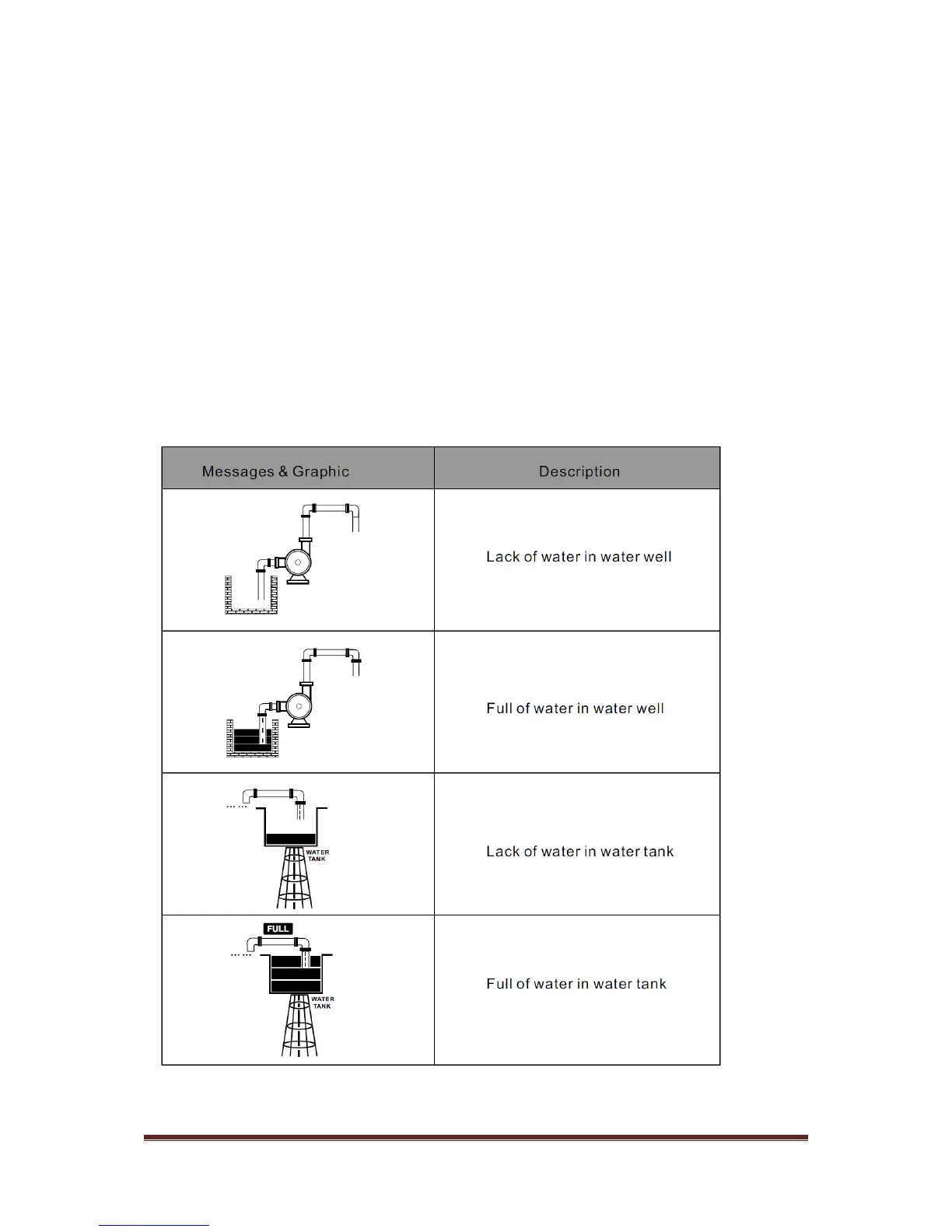 Liquid level in the water storage tank is lower than Probe 1 # (float switch A: Down level), control box will