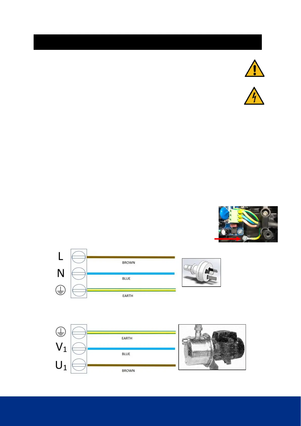 and earth power cable for connection to the pump’s electric motor. This must be connected