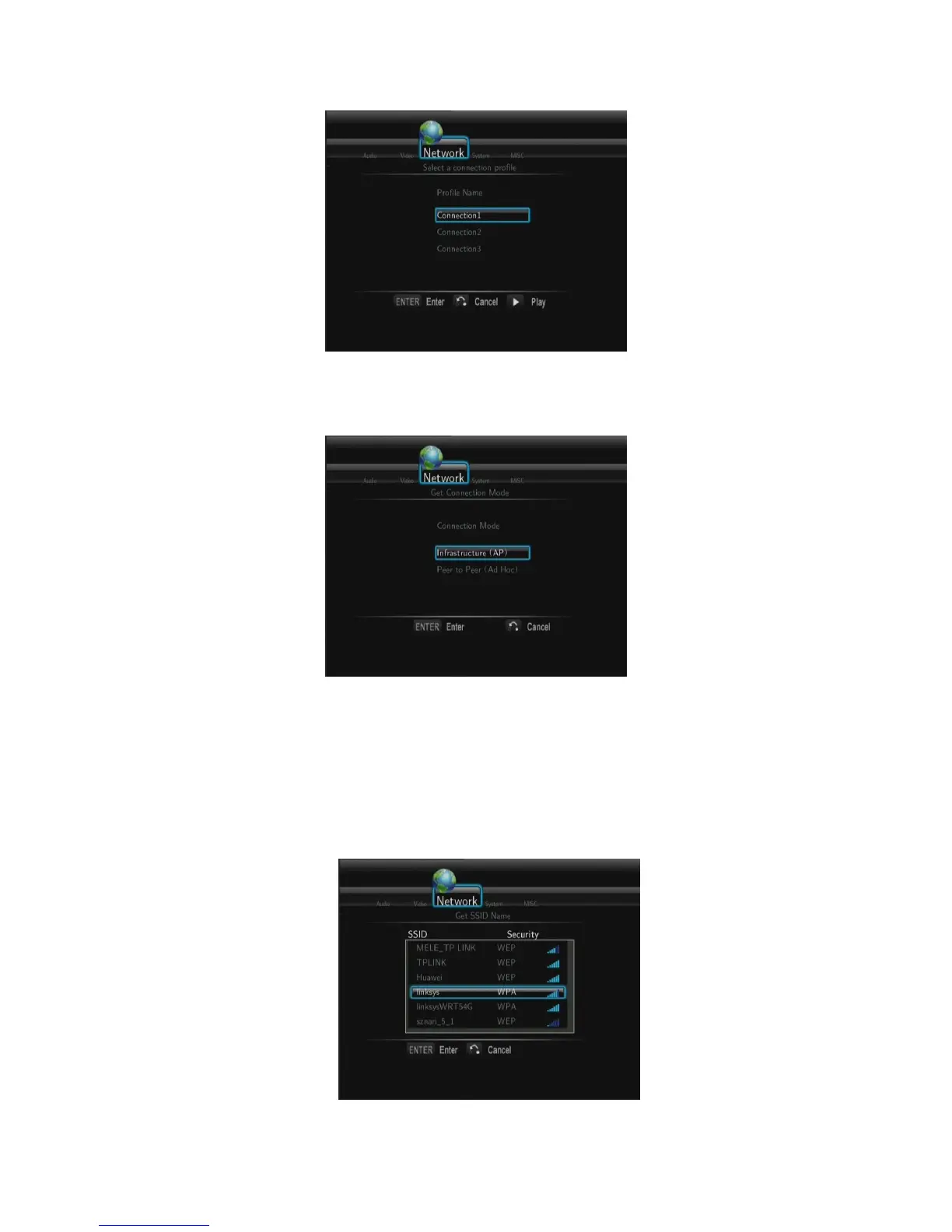 Choose between Infrastructure (AP) and Peer to Peer (Ad Hoc). Press ENTER to go to