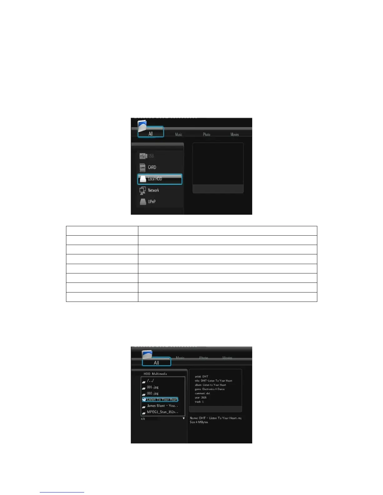 In this mode, all folders and supported contents (music, photos, and movies) will be displayed.