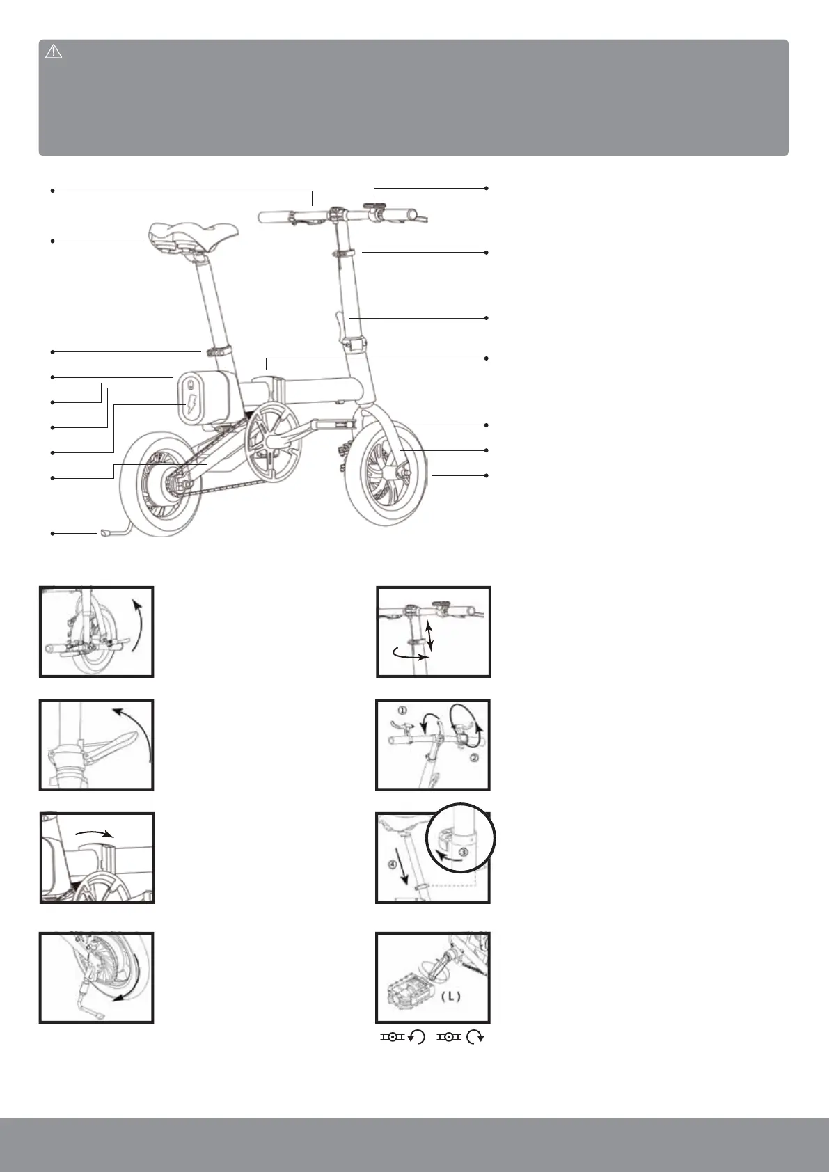 • Электровелосипед поставляется в сложенном состоянии. Поэтому перед первым использованием необходимо настроить