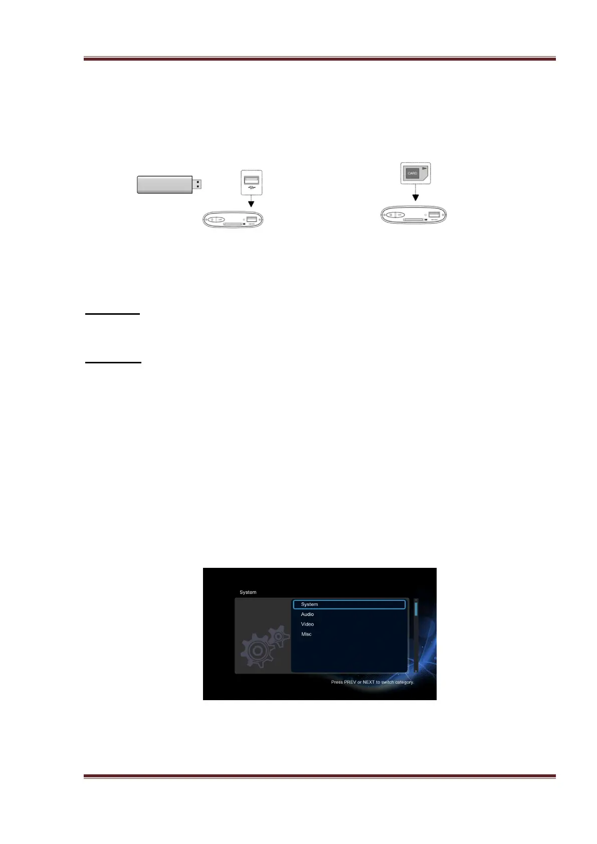 There are four setup options, including System, Audio, Video and MISC. Use the