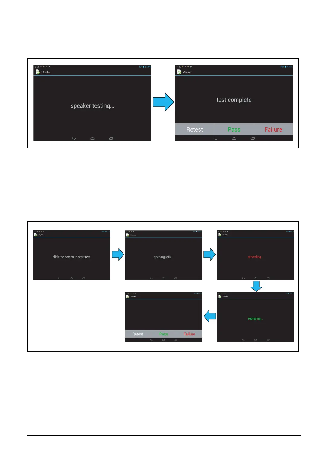 recorded sound quality when the screen shows replaying. Tap “Pass” if the test passes,