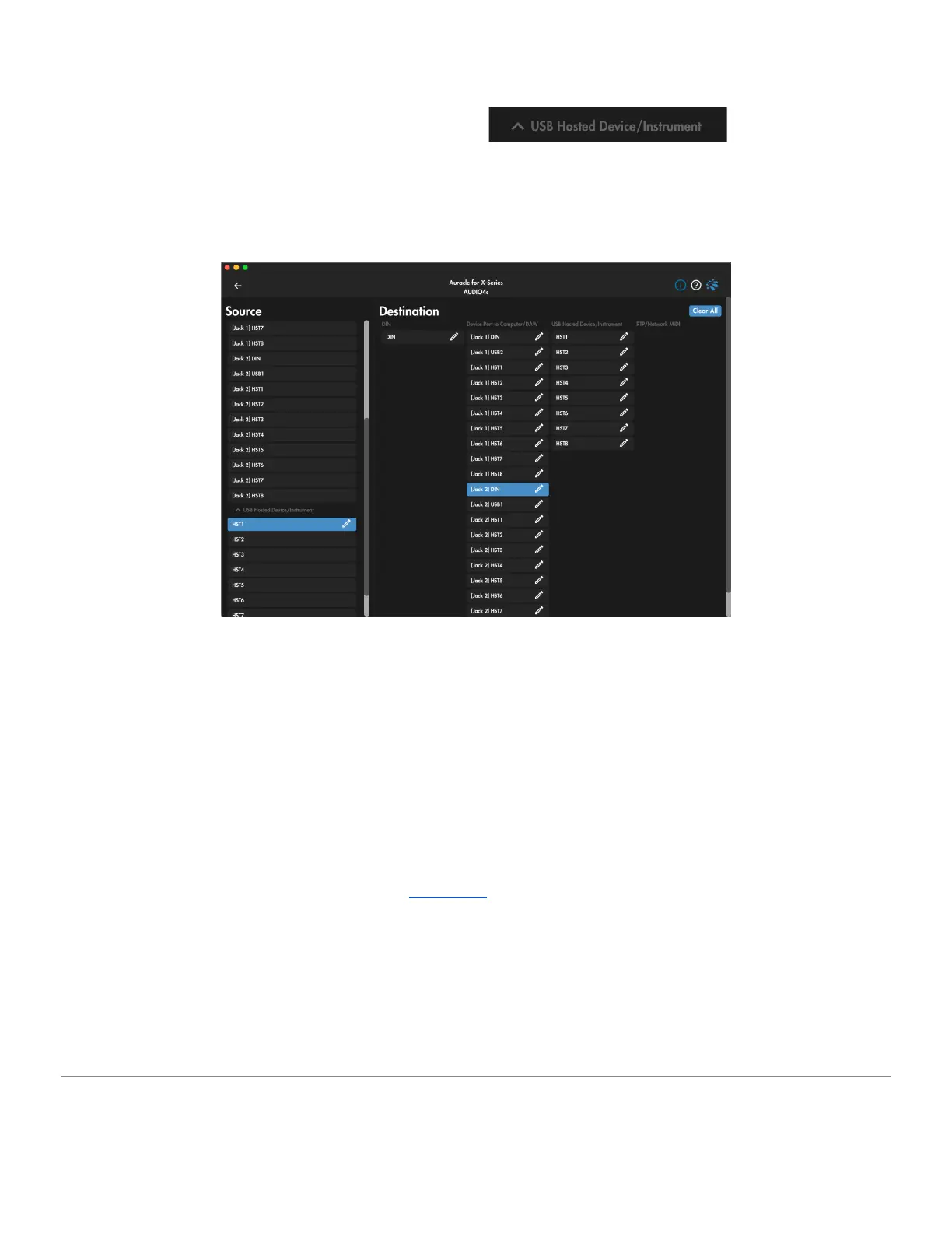 To route your MIDI controller in [HST1] ONLY to the [DIN] port on USB Device jack 2, un-select all
