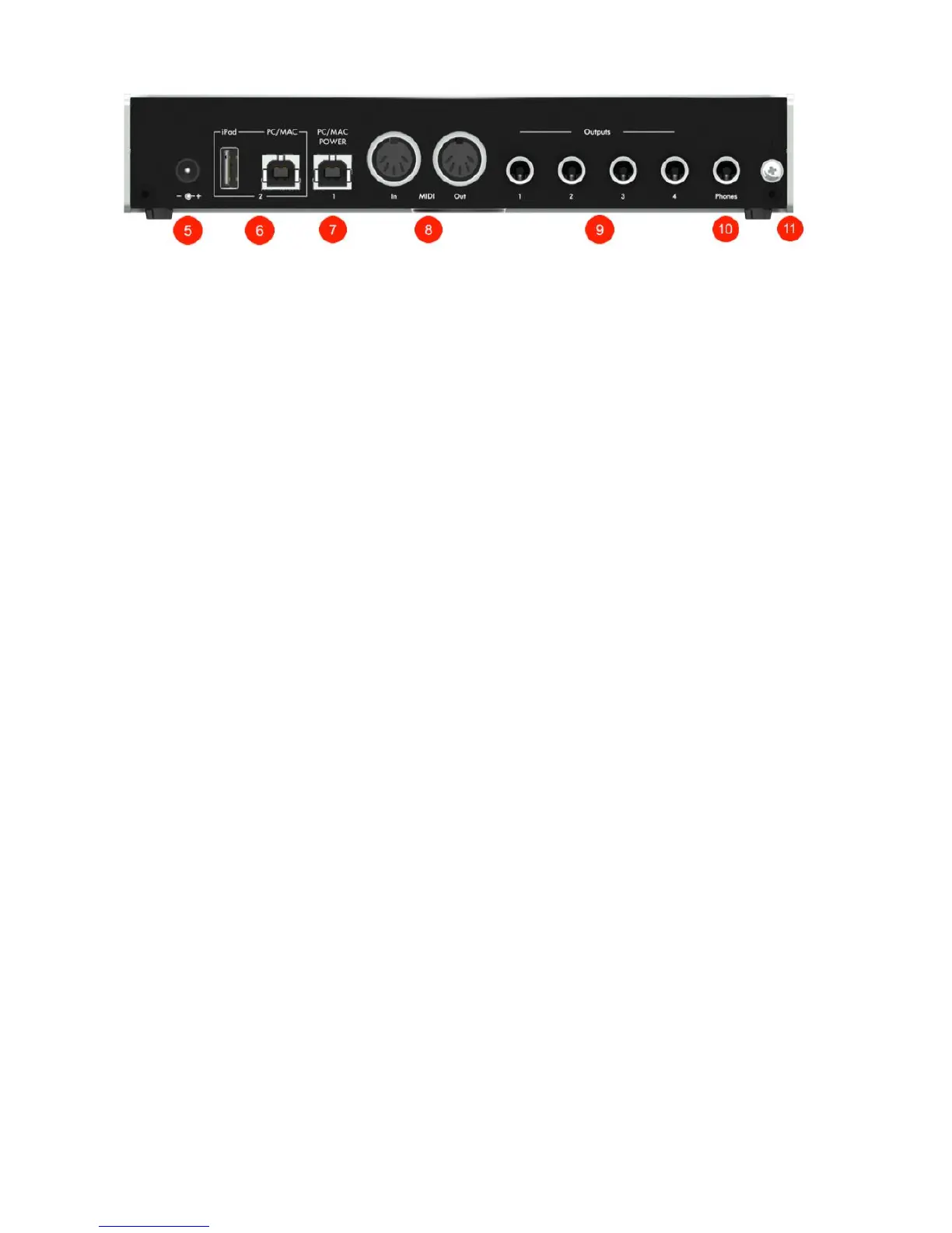 5 Power jack for the optional iConnectivity Power Transformer (sold separately)