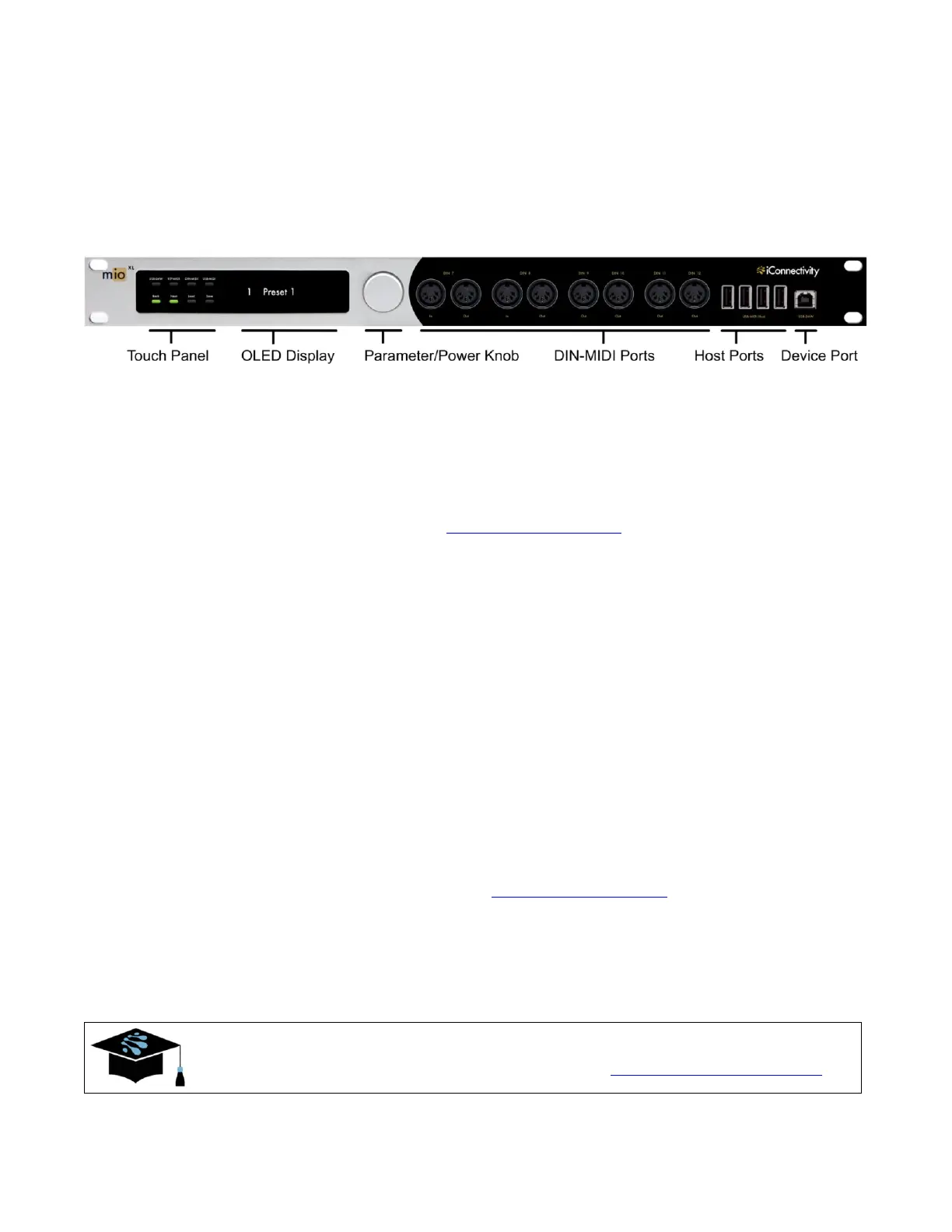 iConnectivity mio XL - mioXL Hardware Overview; mioXL Front Panel UI; mioXL Front Panel Ports