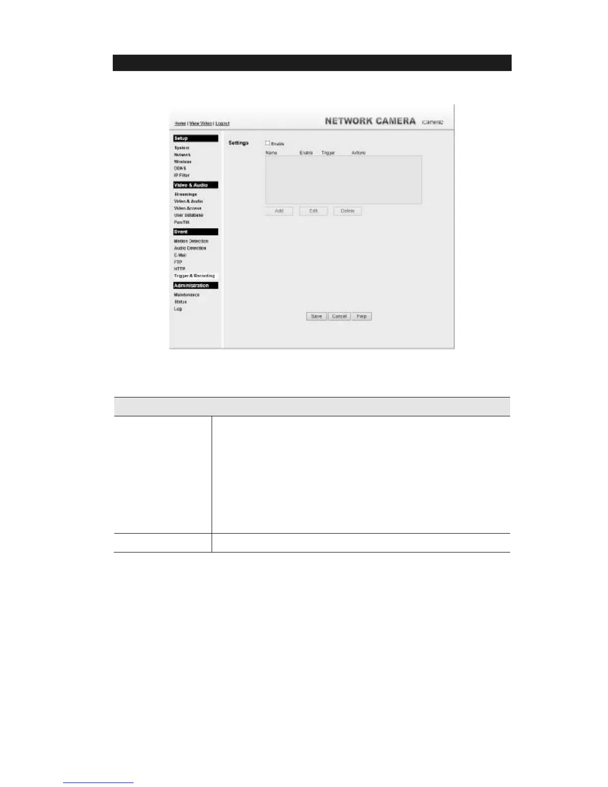 This screen is displayed when the Trigger & Recording option is clicked.