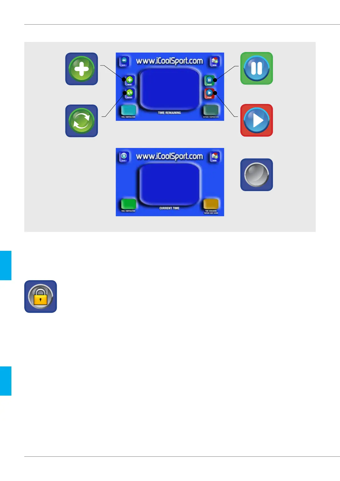 To lock the screen so that no further inputs can be made, touch and hold the iCool icon on the main run screen for more than 10 seconds (you can