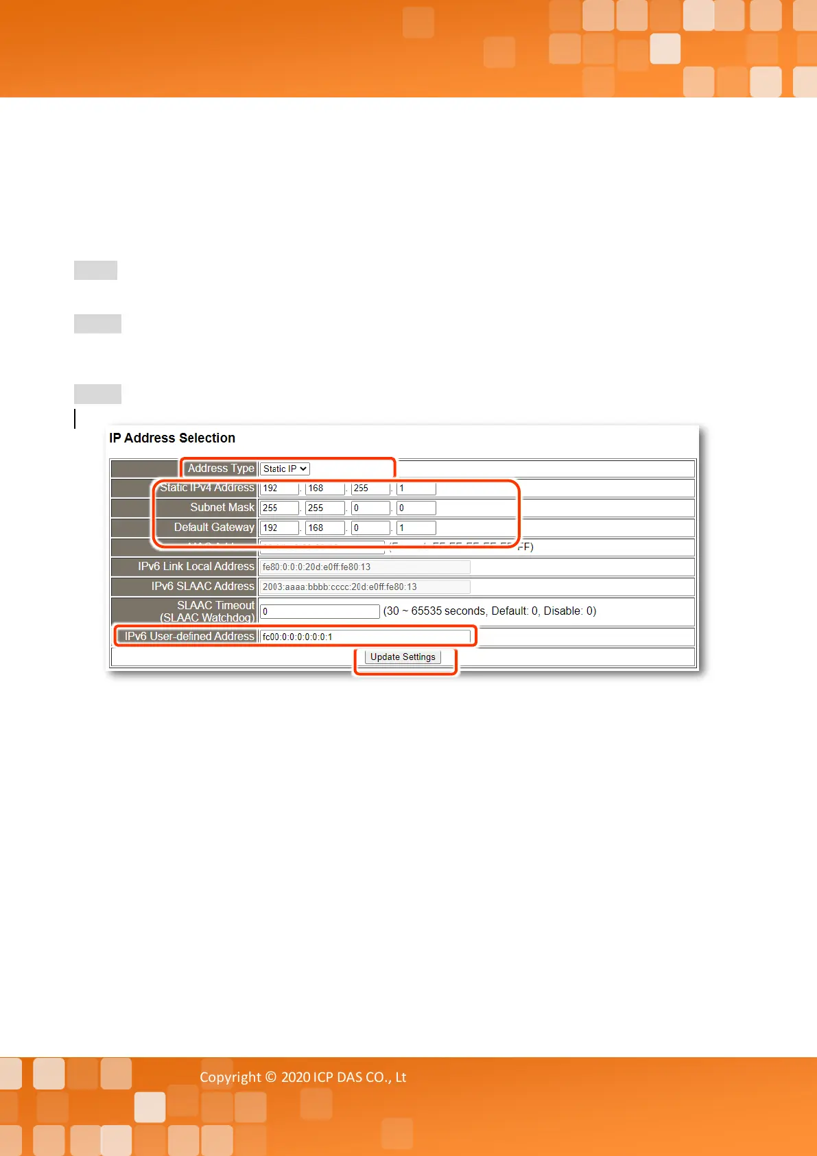 Note: The IPv6 SLAAC Address is auto-configured by Router. The router should provide the prefix and the