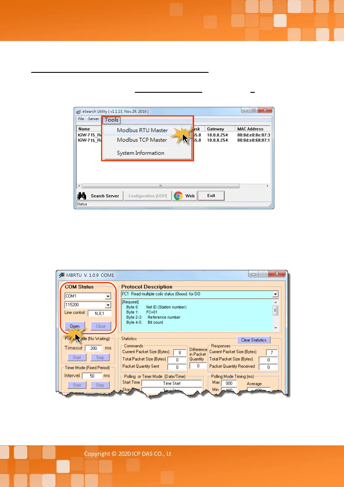 1. In the eSearch Utility, select the “Modbus RTU Master” item from the “Tools” menu to