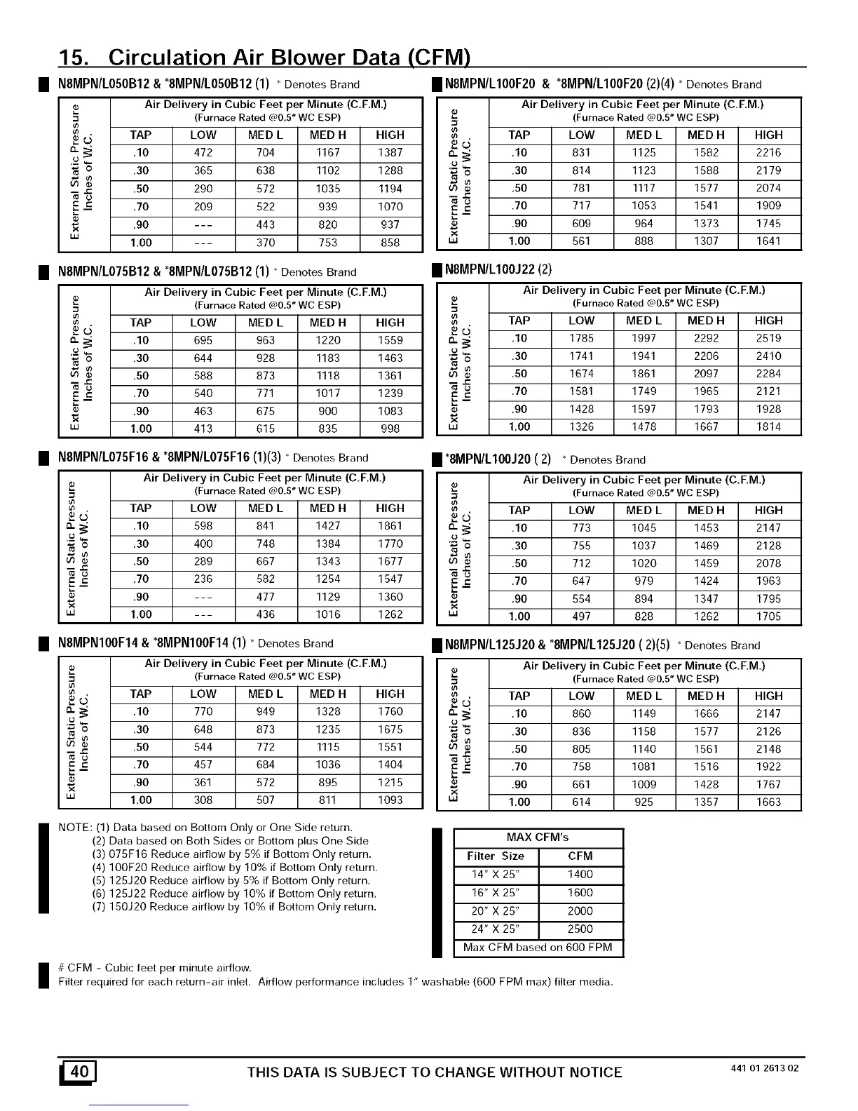 15. Circulation Air Blower Data (CFM)