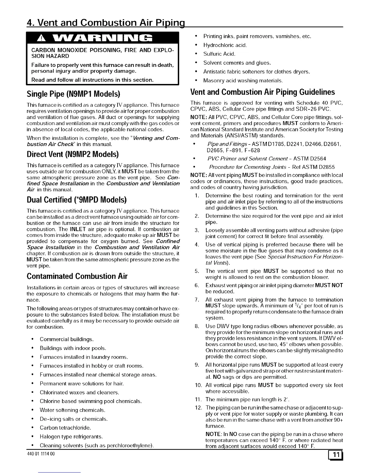 6. Exhaust vent piping or air inlet piping diameter MUST NOT