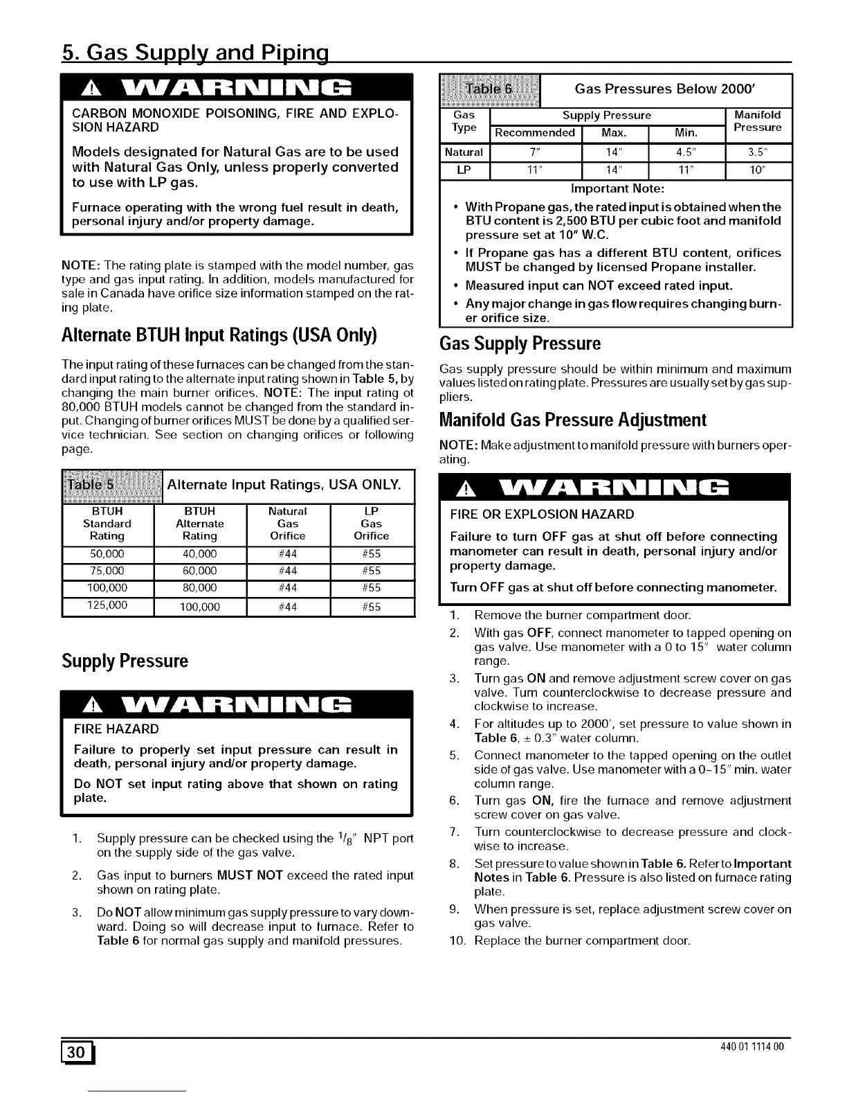 Notes in Table 6. Pressure is also listed on furnace rating