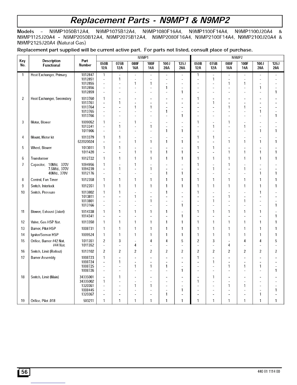 Models - N9MP1050B12A4, N9MP1075B12A4, N9MP1080F16A4, N9MP1100F14A4, N9MP1100J20A4 &