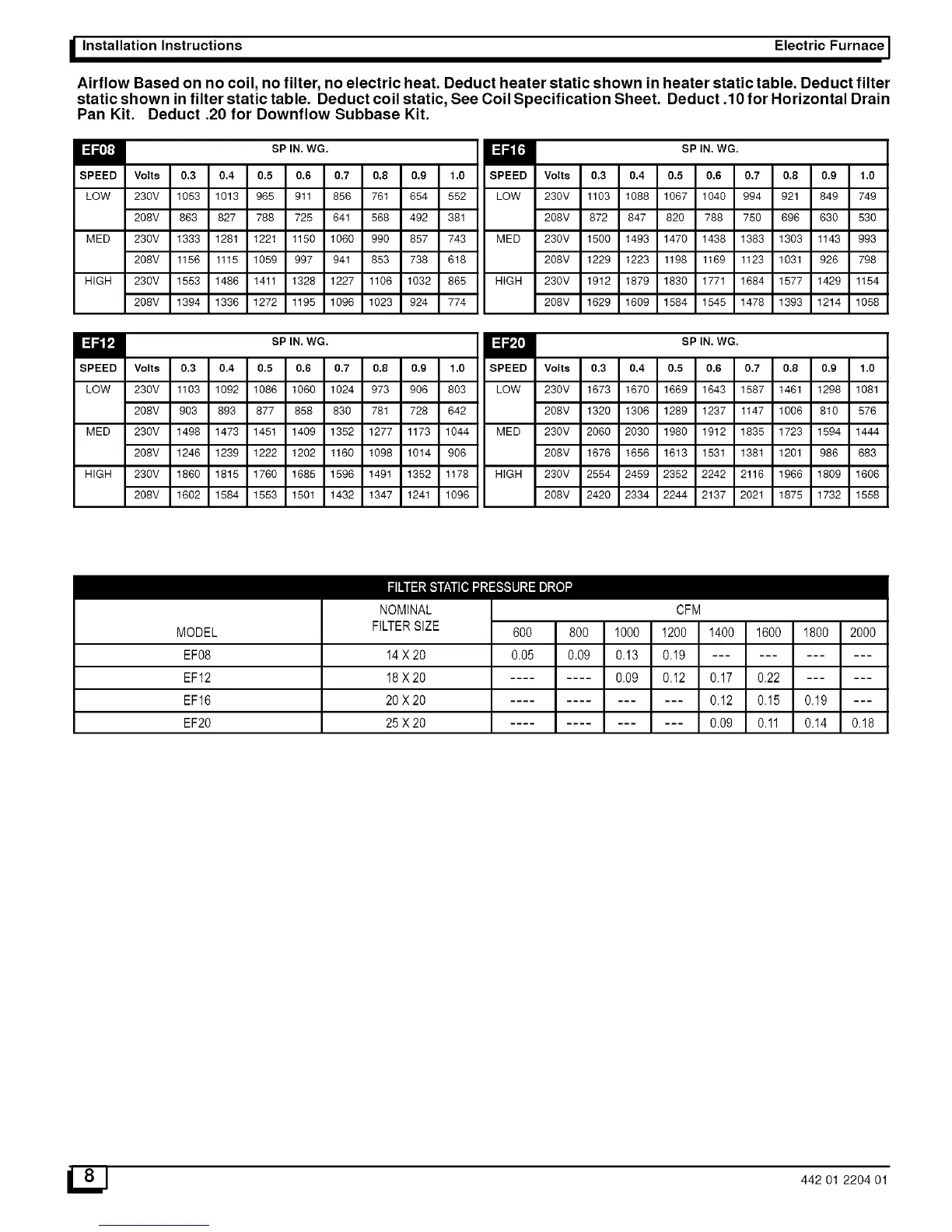 Airflow Based on no coil, no filter, no electric heat. Deduct heater static shown in heater static table. Deduct filter