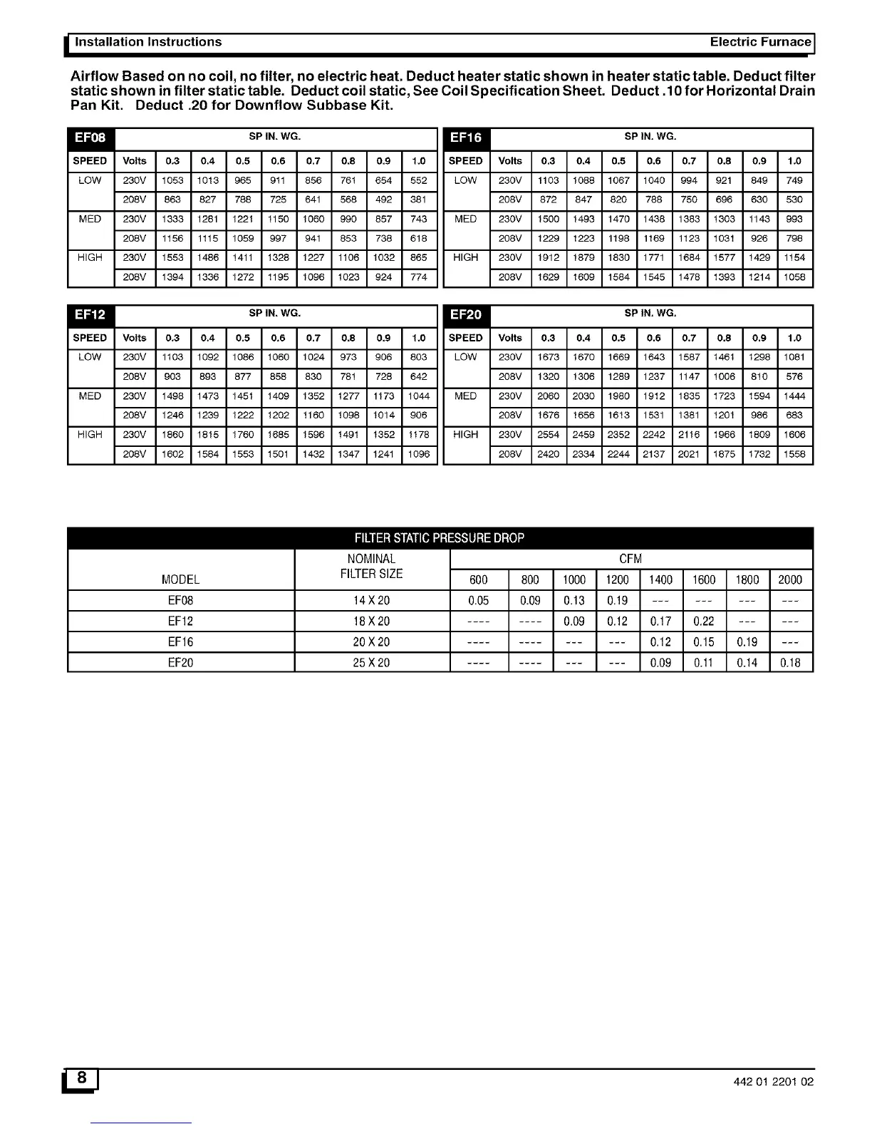 Airflow Based on no coil, no filter, no electric heat. Deduct heater static shown in heater static table. Deduct filter