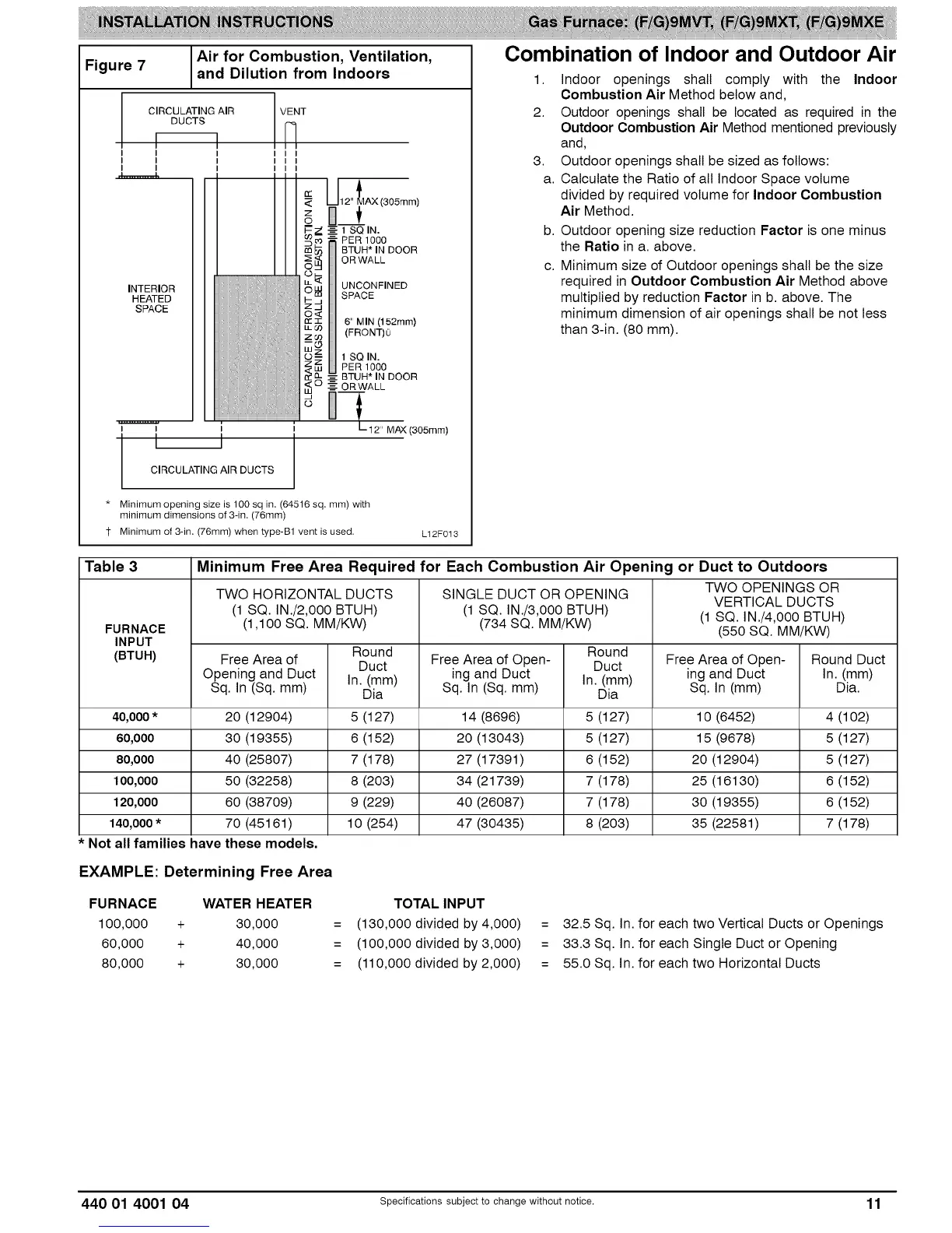 ICP G9MVT - Table 3 Minimum Free Area Required for Each Combustion Air Opening or Duct to Outdoors