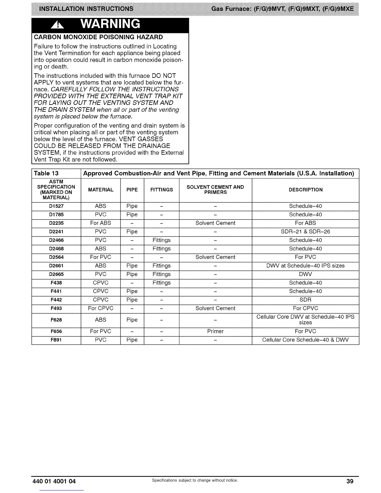 Approved Combustion-Air and Vent Pipe, Fitting and Cement Materials (U.S.A. Installation)