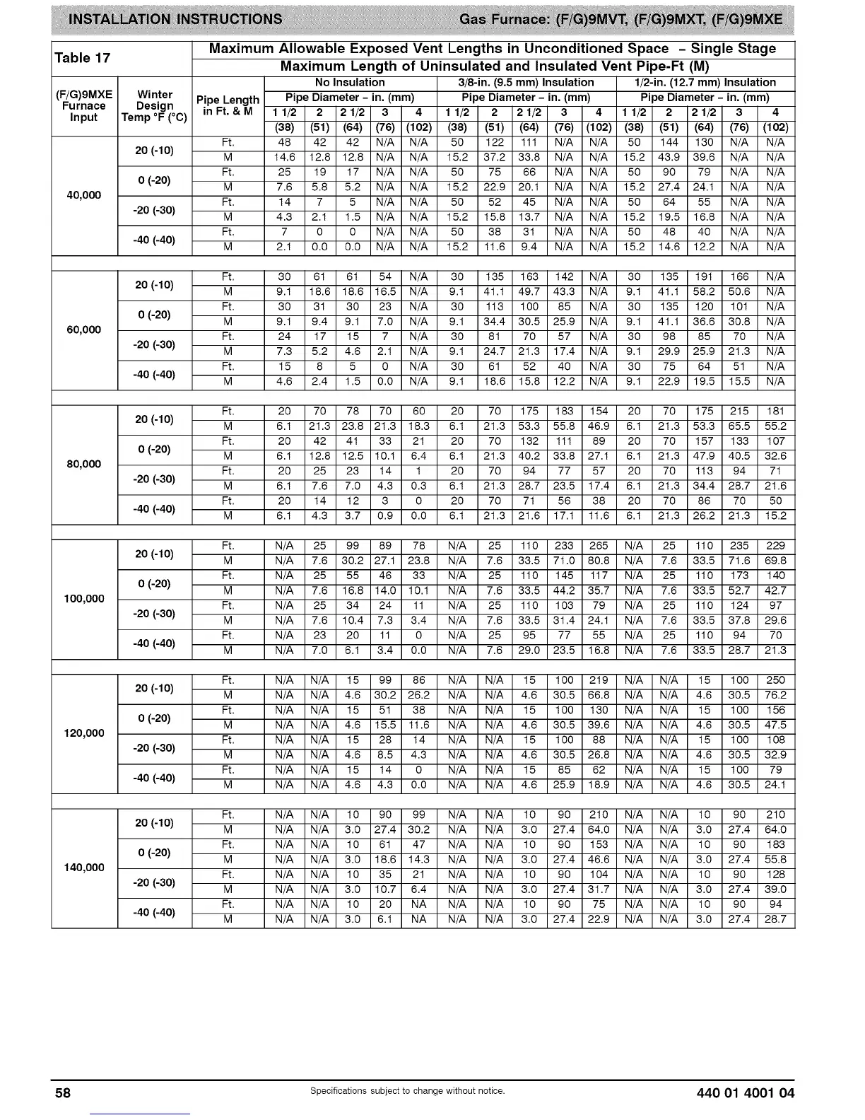 ICP G9MVT - Table 17 Maximum Allowable Exposed Vent Lengths in Unconditioned Space - Single Stage