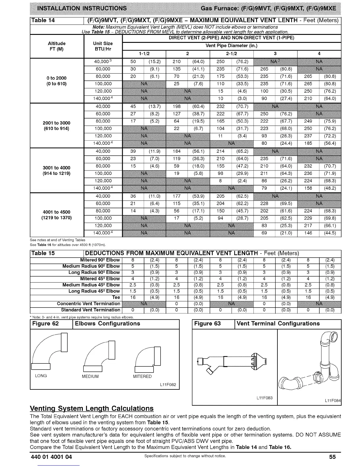 (F/G)9MVT, (F/G)9MXT, (F/G)9MXE - MAXIMUM EQUIVALENT VENT LENTH - Feet (Meters)