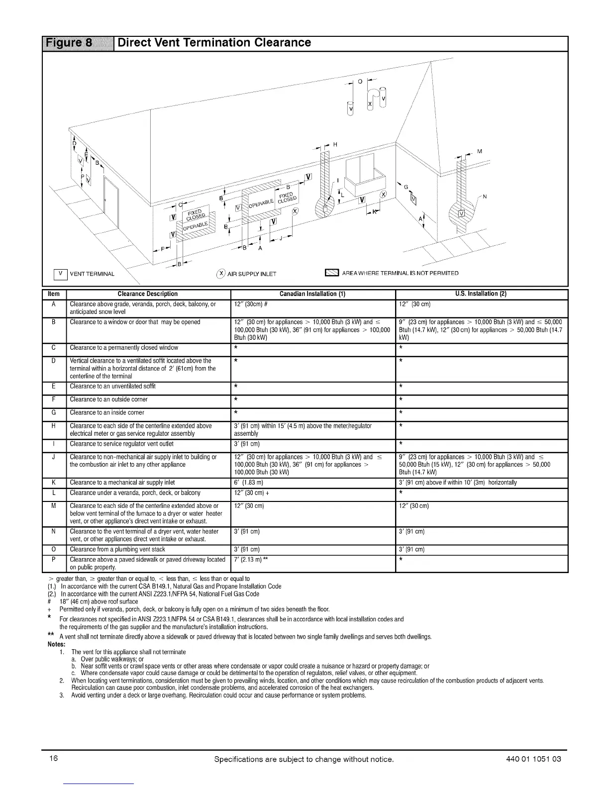 B Clearanceto awindowordoorthat maybe opened 12" (30cm) forappliances > 10,000Btuh (3kW) and < 9" (23 cm) for appliances > 10,000Btuh(3 kW)and < 50,000